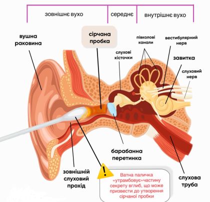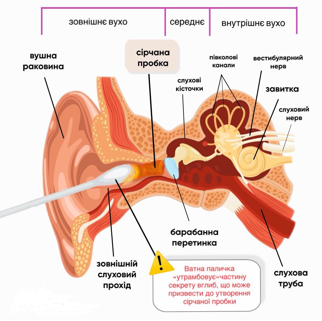 ❗️Але якщо вода потрапляє у вухо (наприклад, під час купання чи пірнання), сірчана пробка набухає та збільшується в розмірах, повністю перекриваючи слуховий прохід.